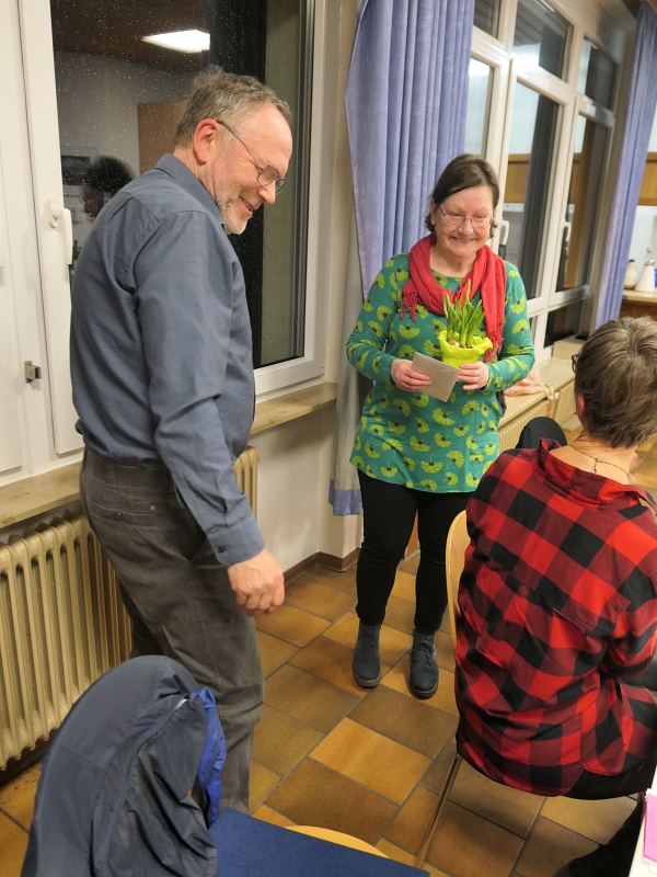 Irmela Koch dankt Winfried Koch und Ulrich Bayha im Namen aller Mitglieder mit einem kleinen Geschenk für ihr großes Engagement.