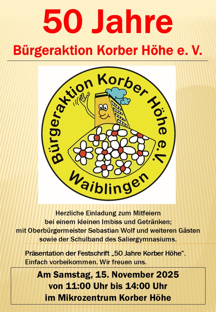 Die Bürgeraktion Korber Höhe e. V. wird diesen Herbst 50 Jahre alt. Das wollen wir bei einem lockeren Zusammensein im Mikrozentrum gemeinsam feiern.