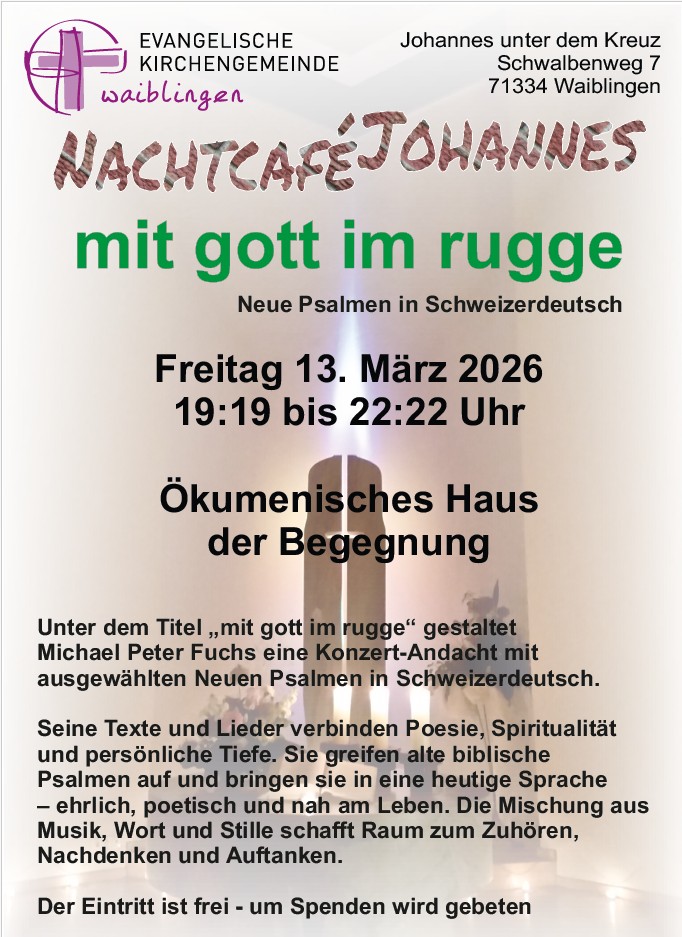 Am 13.03.2026 ist der in Norddeutschland in einer christlichen Basisgemeinde lebende Schweizer Michael Peter Fuchs auf seiner fünften Süddeutschland-Schweiz-Tournee. Zu Gast in geistlichen Gemeinschaften, Kirchengemeinden, Klöstern gastiert er auch auf der Korber Höhe im Ökumenischen Haus der Begegnung Korber Höhe Waiblingen im Johannessaal um 19.45 Uhr.